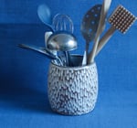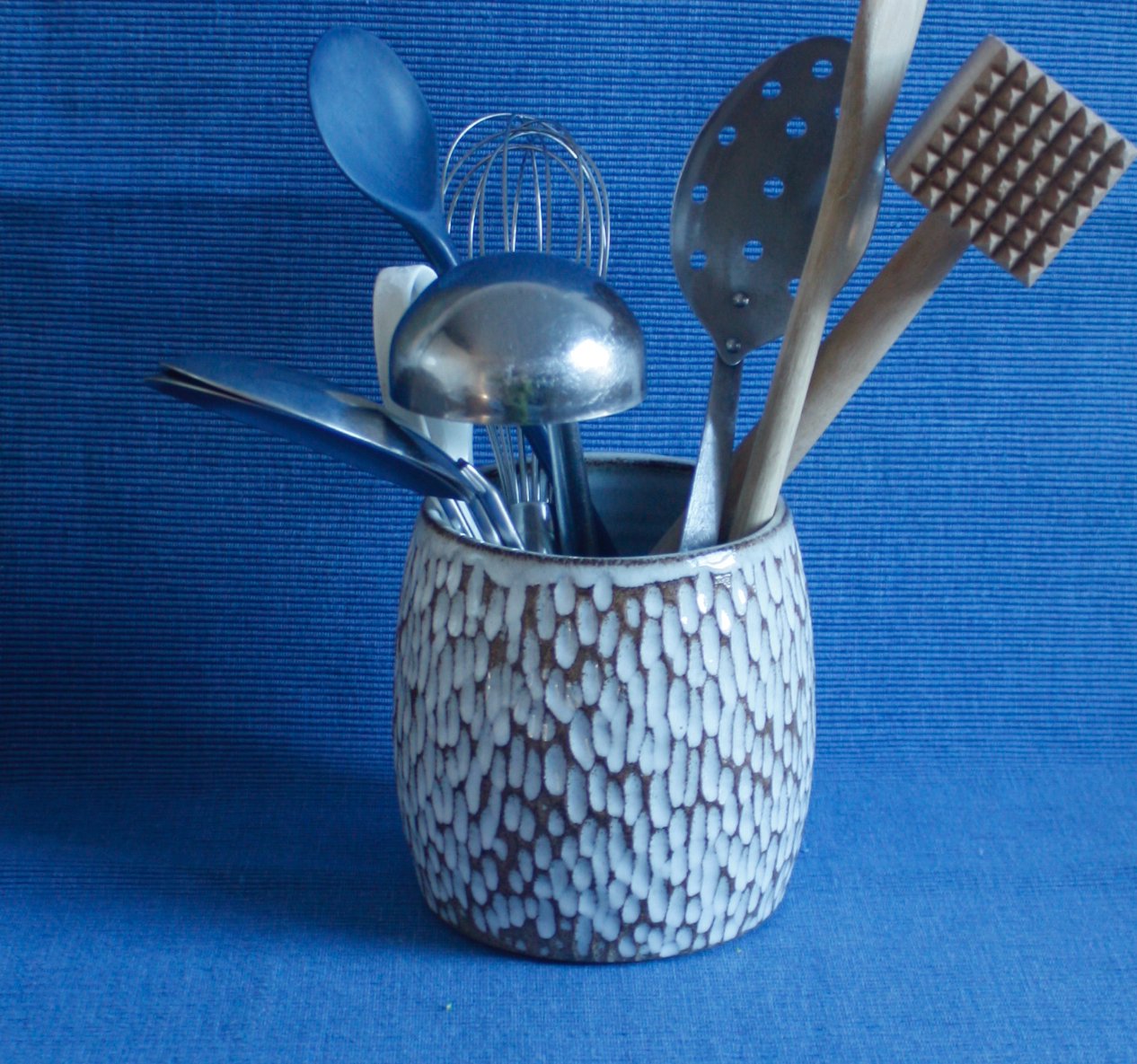 A wheel-thrown utensil holder in flecked grey stoneware, carved on the outside and glazed in a glossy white glaze.