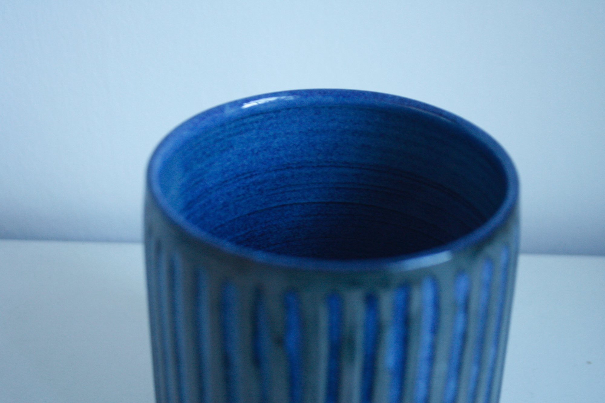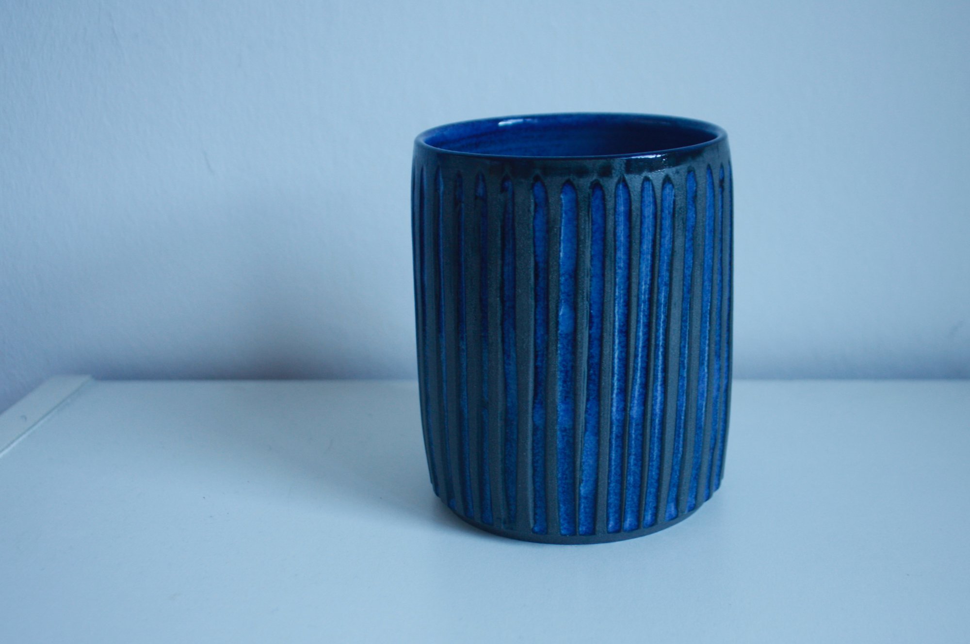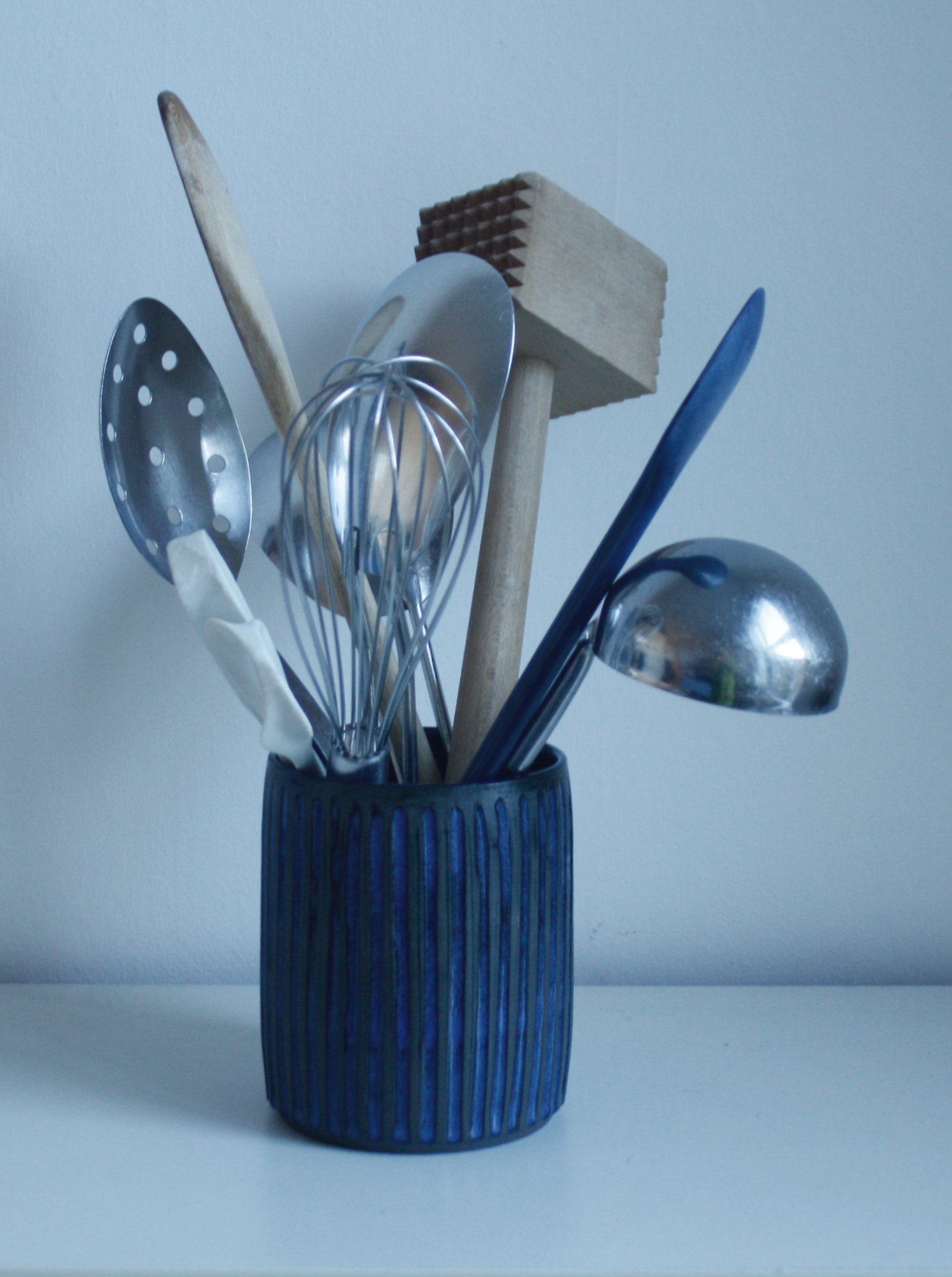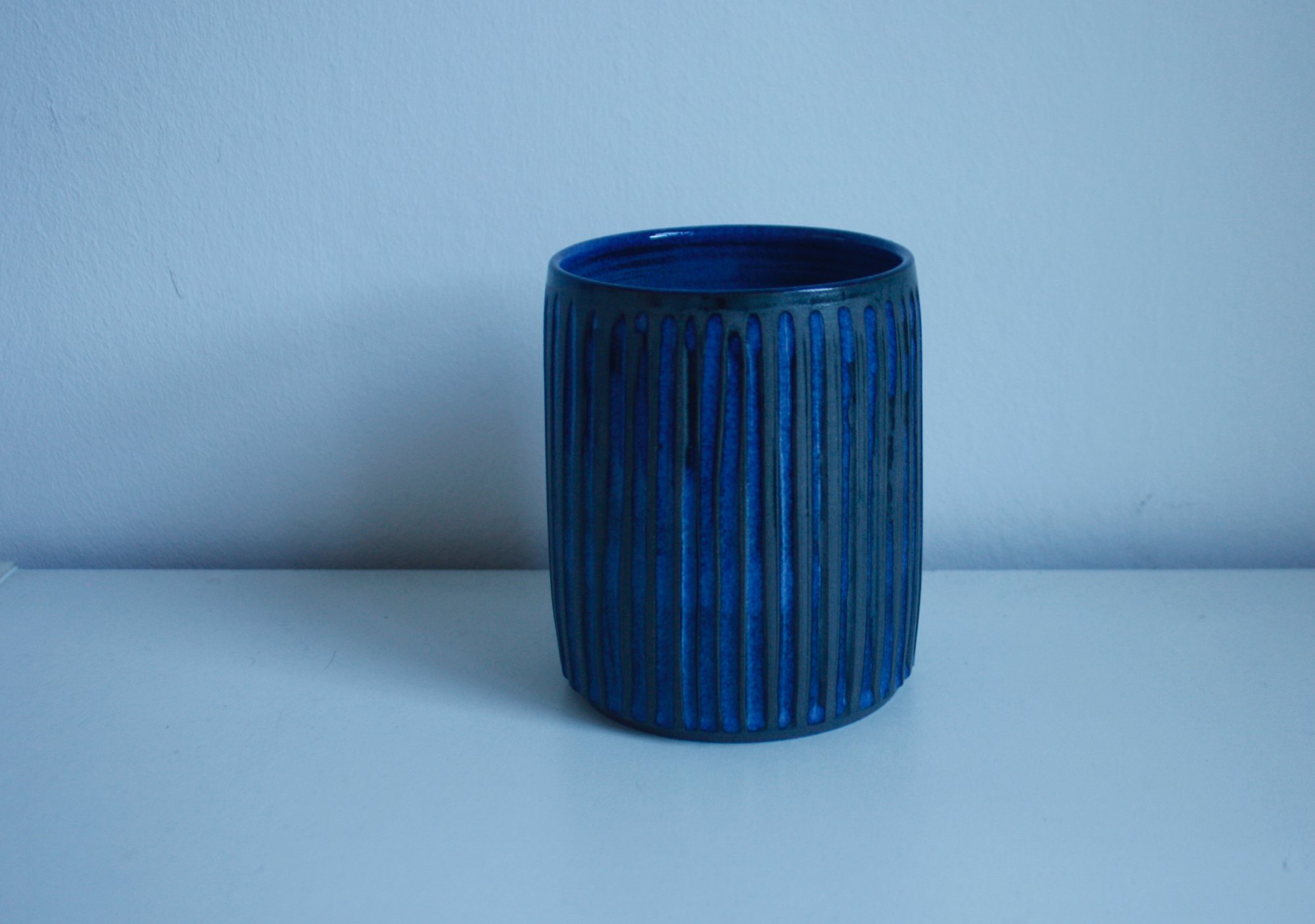 Another smaller utensil holder that can still hold a lot of useful items. Thrown in dark stoneware clay, it has been fluted and sgafittoed, and then glazed with a glossy blue glaze.