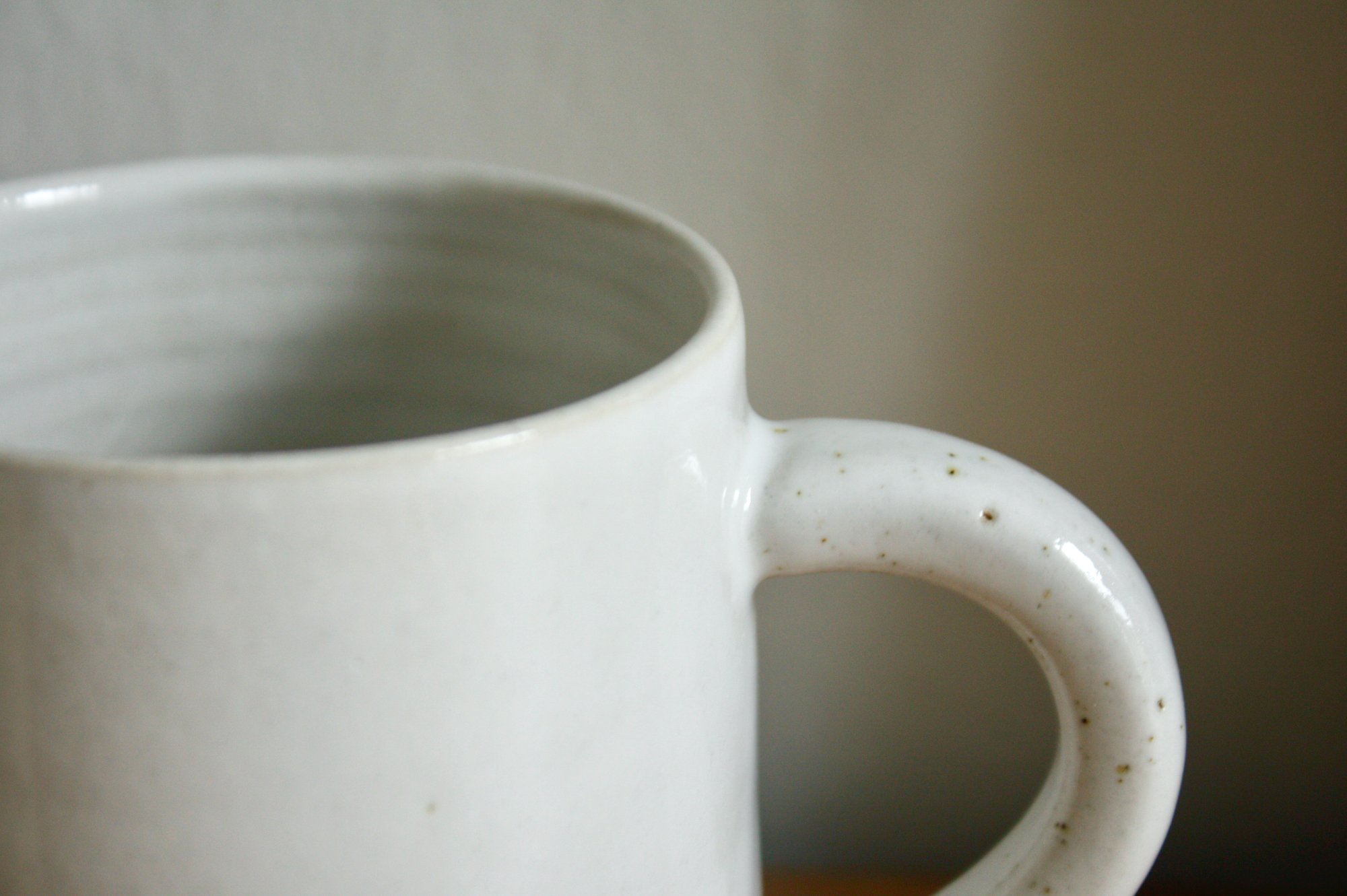 Extra large wheel-thrown mug in smooth white stoneware with a lightly flecked handle for those early morning cups of tea you really need. Finished in a glossy white glaze with bare clay stripes.