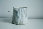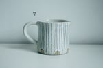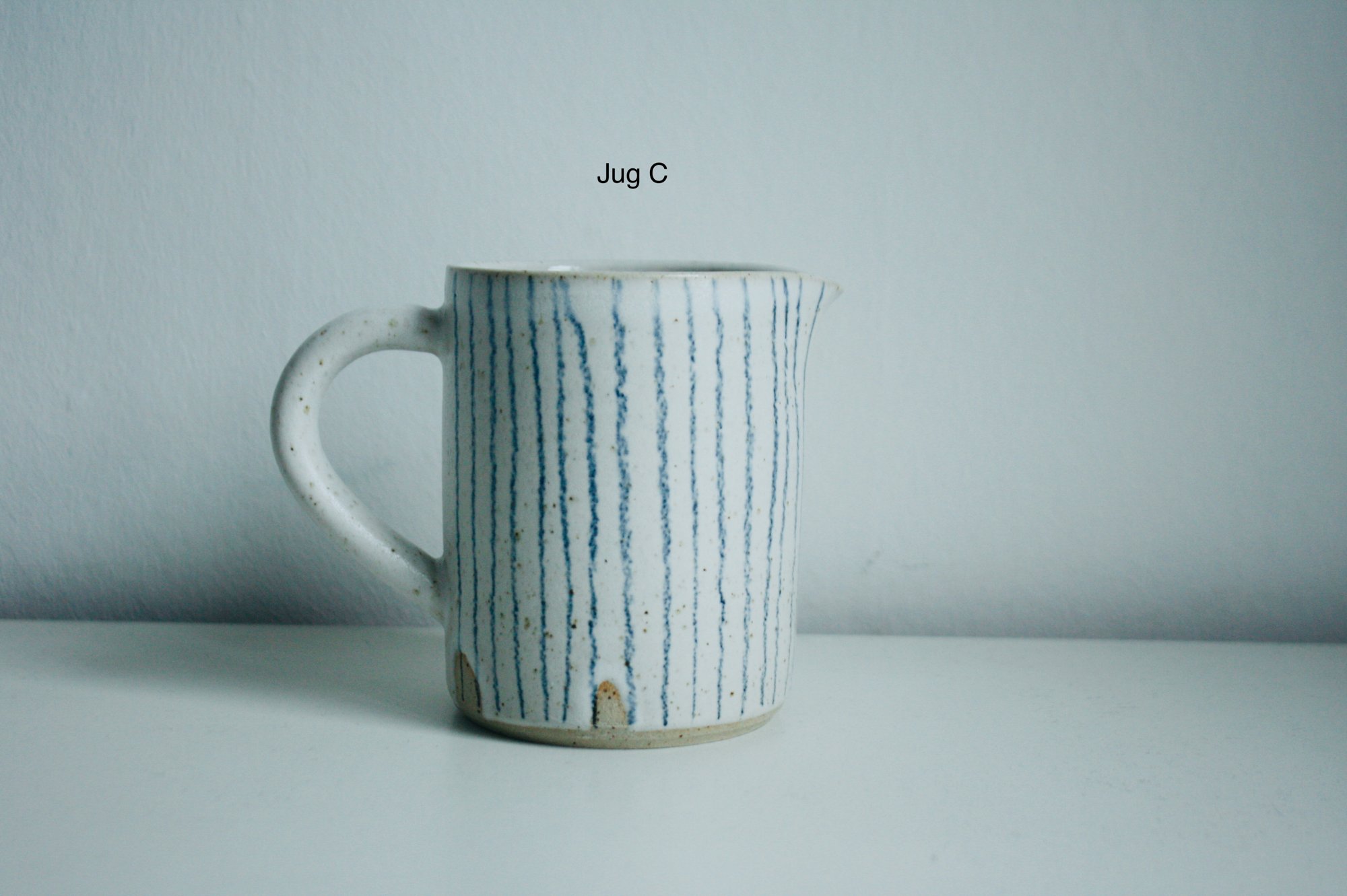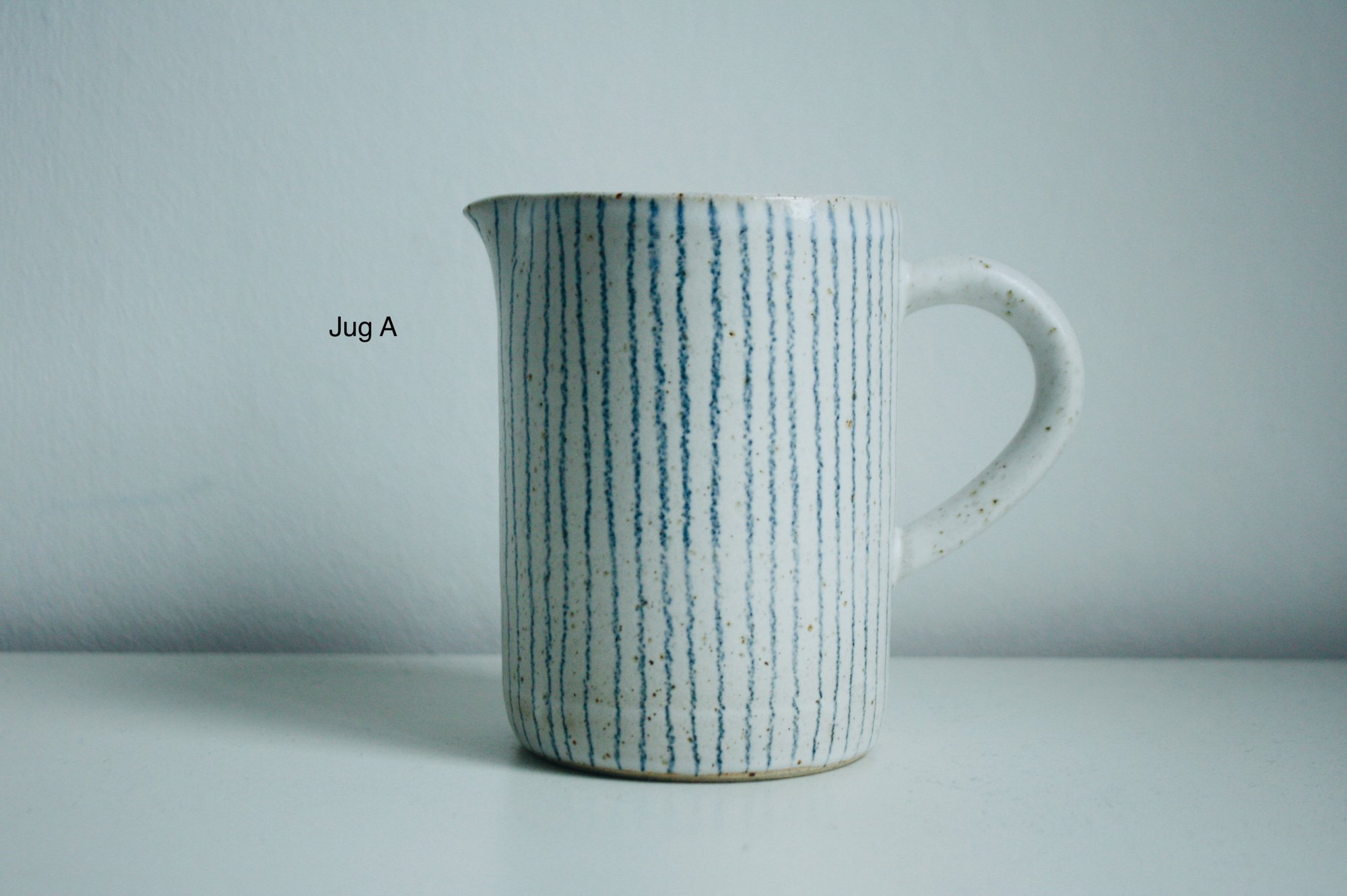Wheel-thrown flecked white stoneware jugs, glossy white glaze inside, matt white glaze outside with some glaze overlap around the rim. Hand-drawn underglaze pencil stripes.