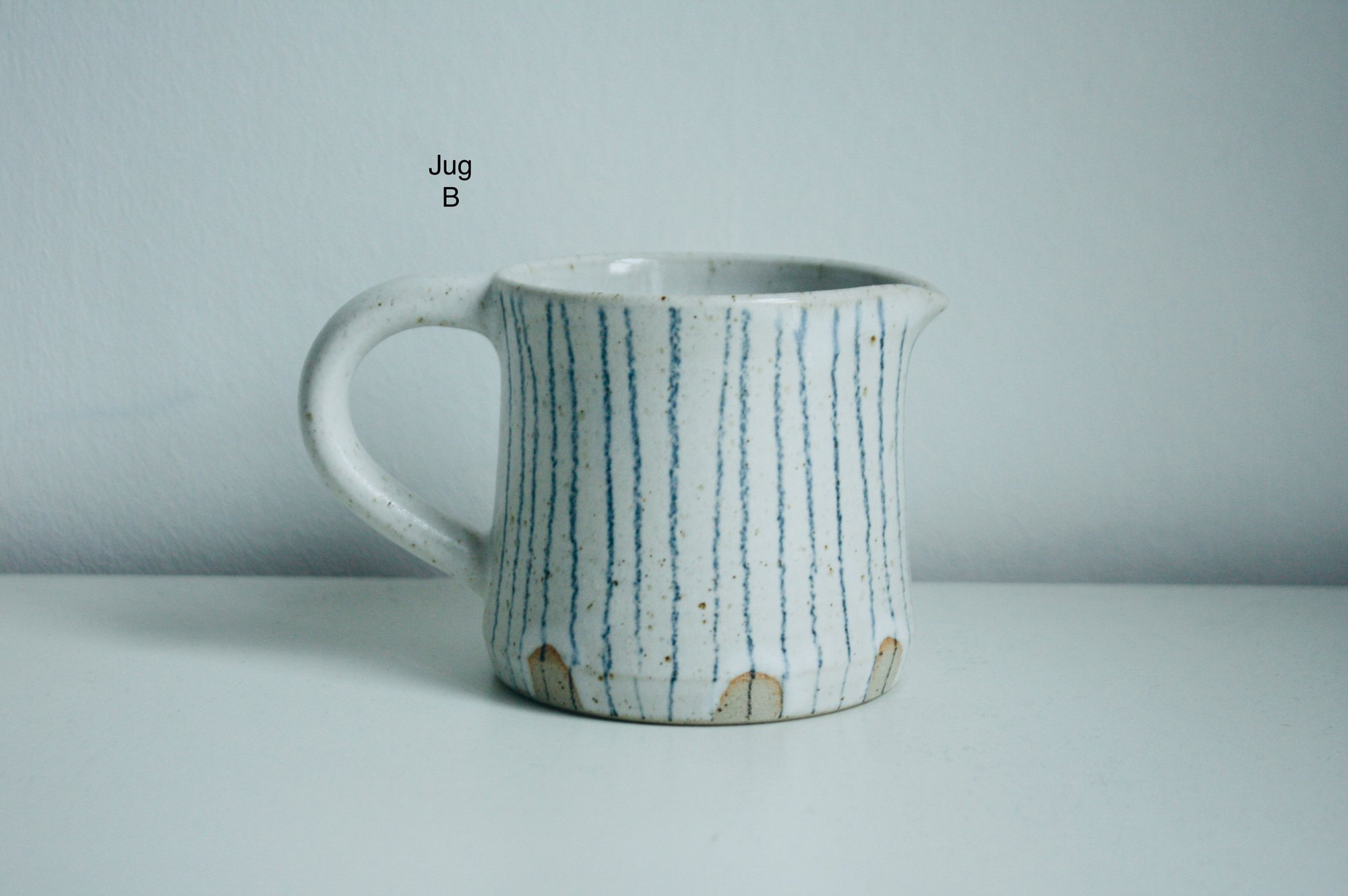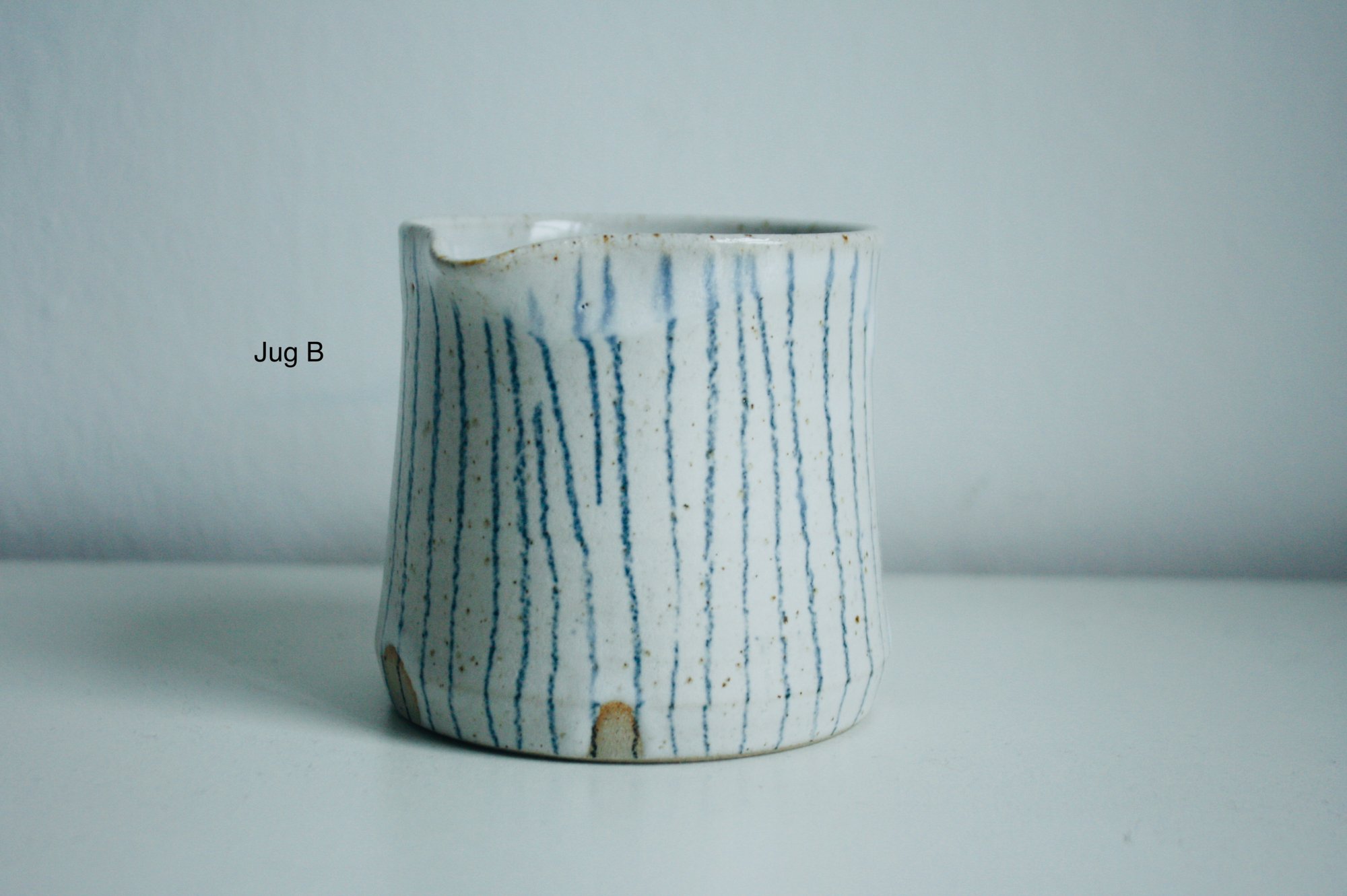 These are one-offs and all the mugs have different amounts of glaze overlap at the rim. On the flared jug (B), the pencil lines are slightly random under the spout - see image. Jug A has no fingermarks at the base.