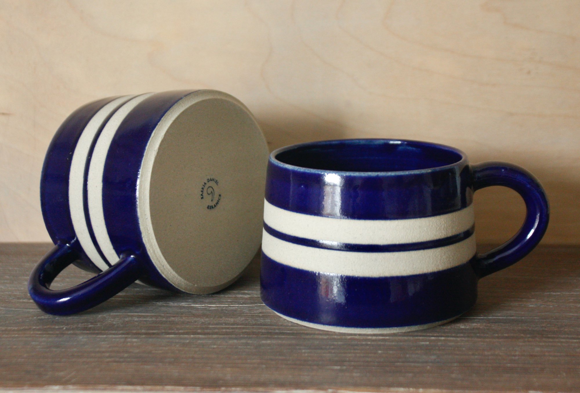 Wheel-thrown mug in smooth white stoneware, decorated with a glossy blue glaze and bare clay stripes.
